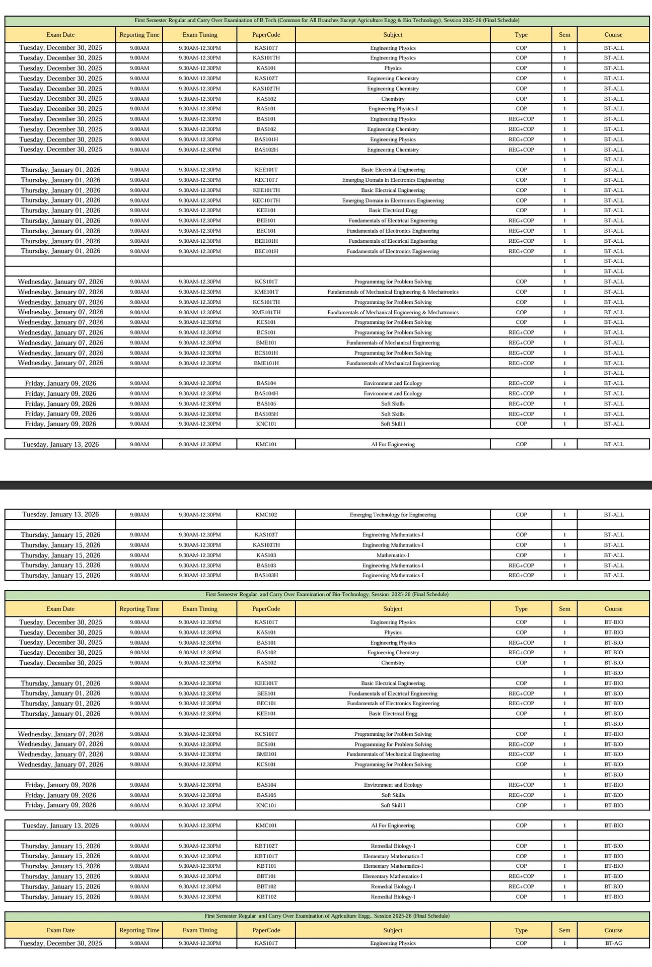 Extended datesheet for 1st and 2nd semester of the session 2025-26